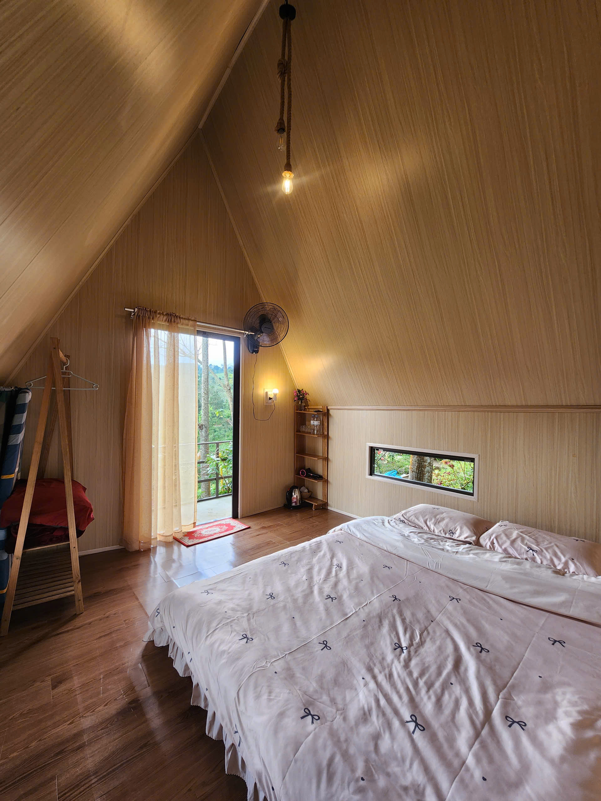 - Nhà Trên Đồi gồm có 5 căn, diện tích 15m2/ căn. Giường 1m4, nệm phụ 1m2, quạt, nước nóng lạnh, vệ sinh khép kính