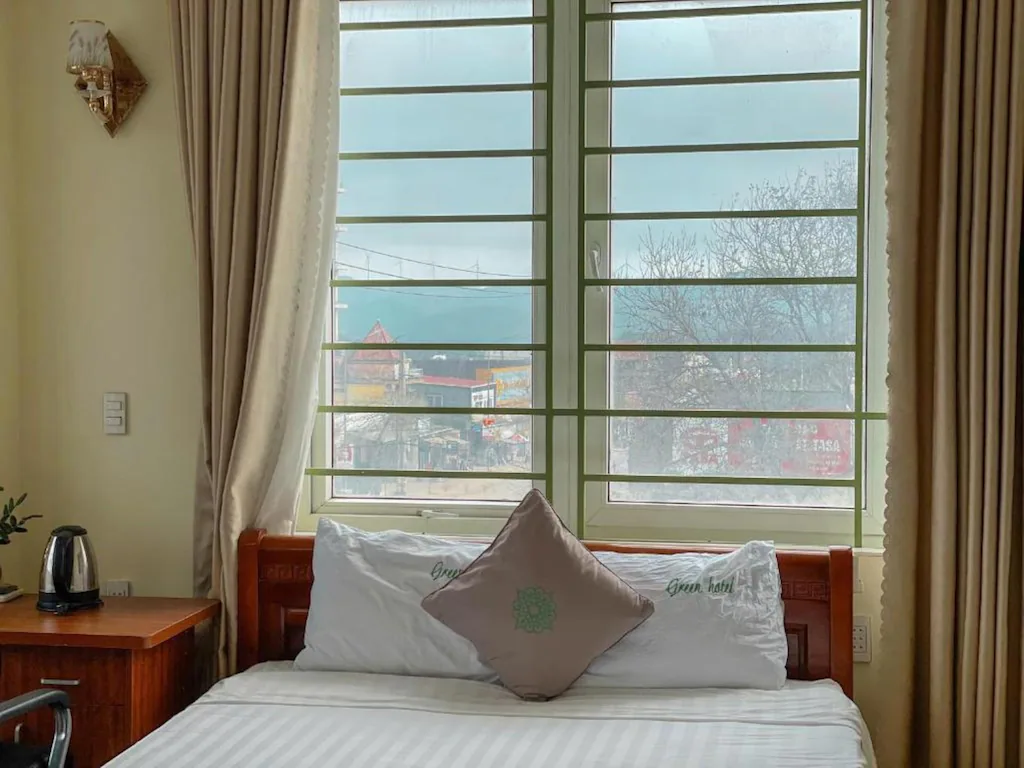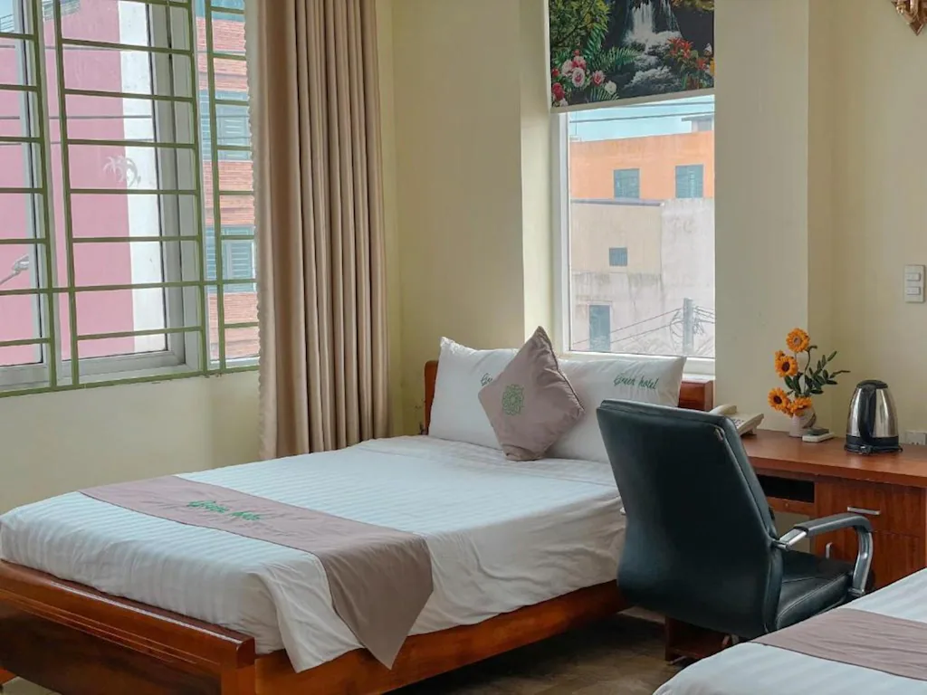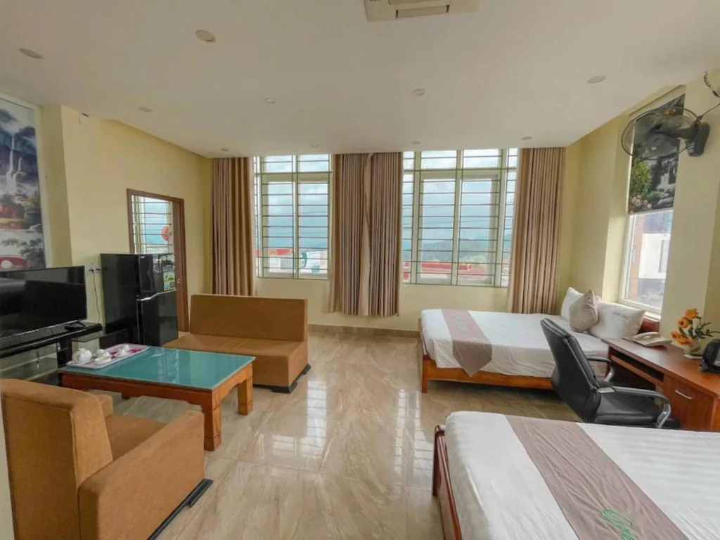 Phòng rộng 45m² với hai giường đôi 1m6 êm ái cho 4 người, ban công thoáng đãng ngắm nhìn khung cảnh thành phố, và khu vực bếp riêng tiện lợi.