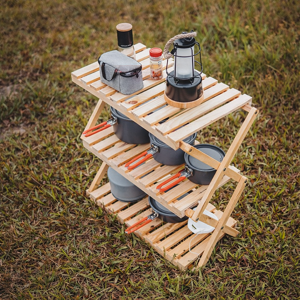 Thuê kệ gỗ camping Khe Sanh – Kệ gỗ 3 tầng xếp gọn tiện lợi